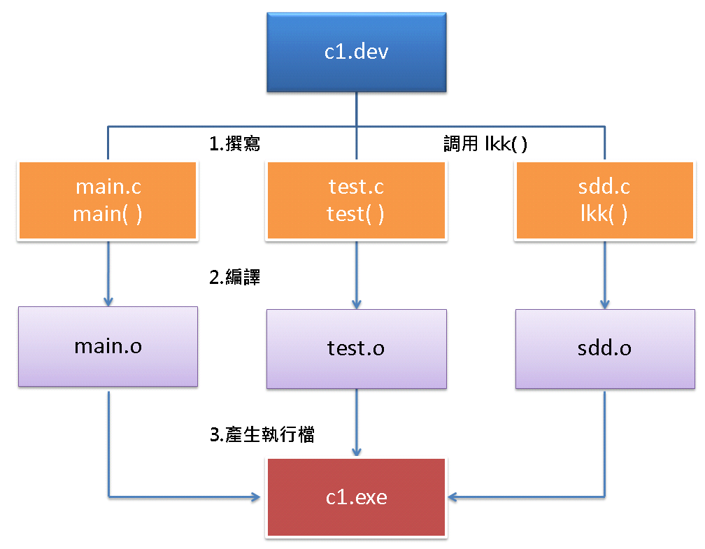 《 專案中( c1.dev )每個原始程式檔 ( *.c ),個別編譯成目的檔( *.o ),再將所有目的檔與函數庫連結成一個執行檔 ( c1.exe ) 》